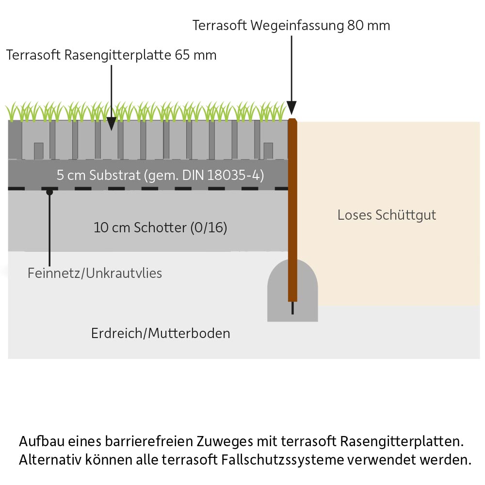 - Ermöglicht barrierefreie Zuwegung zu Spielgeräten (Rollstuhl/Rollator)
